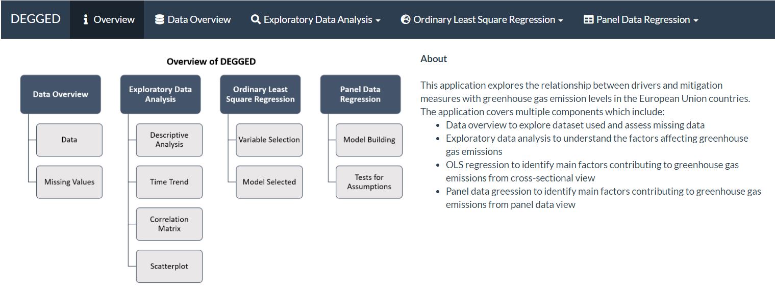 Dynamic Exploration of Greenhouse Gas Emissions and its Determinants using R and Shiny, DEGGED in short, is a web-enabled client-based analytics tool built on R Shiny that allows users to perform exploratory data analysis, ordinary least squares regression and panel data regression to examine the relationship between drivers and mitigation measures with greenhouse gas emission levels.